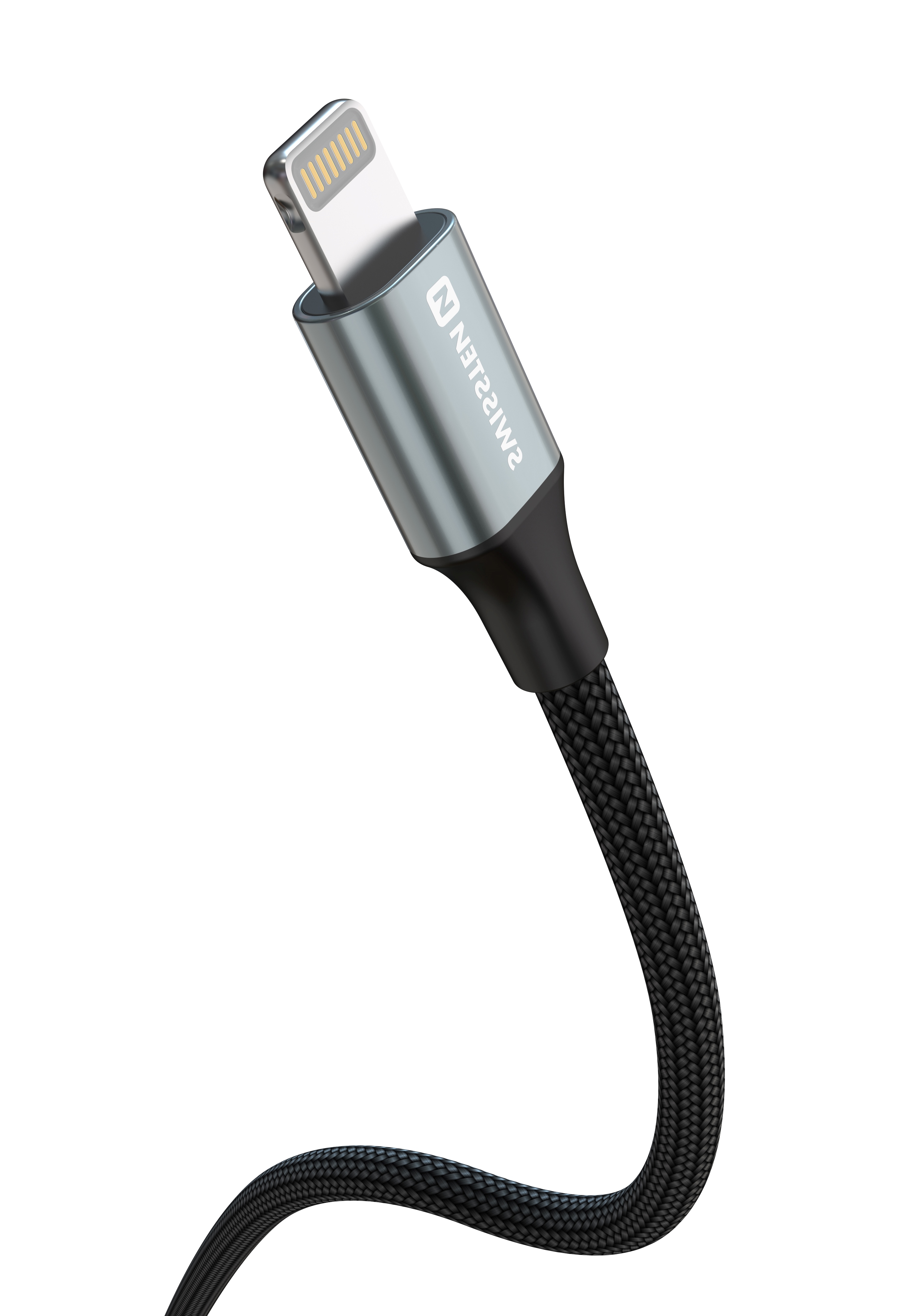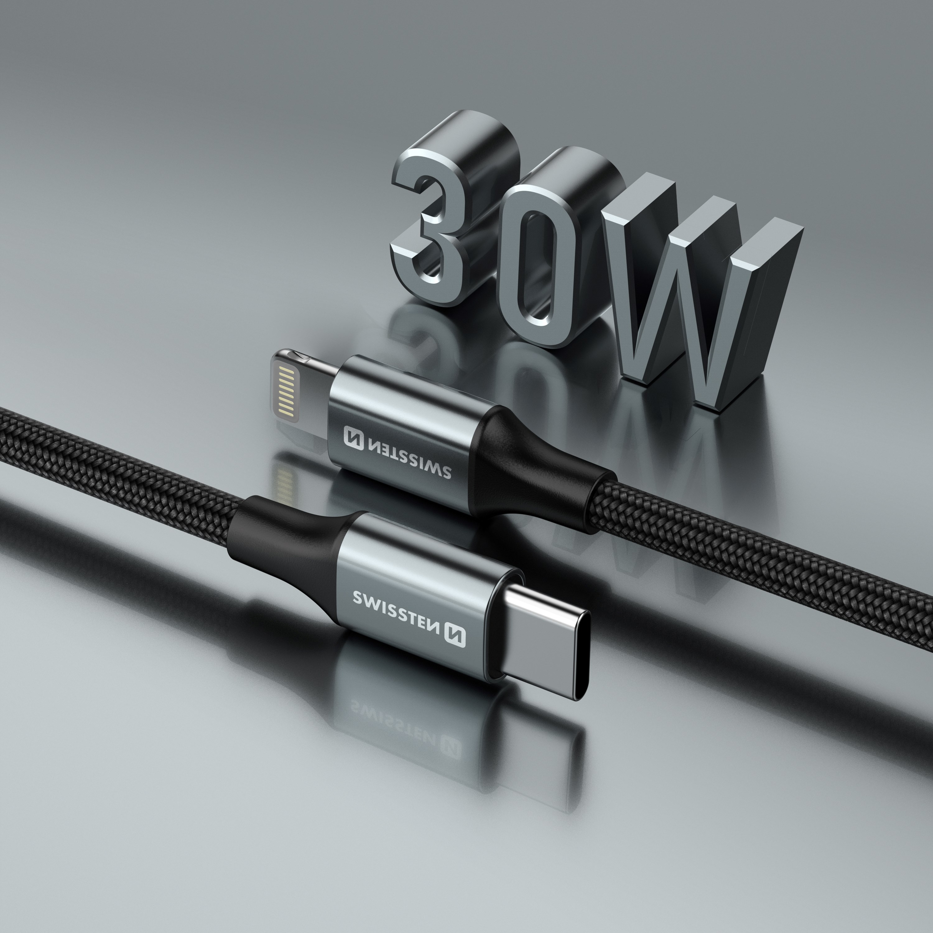 SWISSTEN kabel USB-C/Lightning TEXTILE II, 3A, 30W, 480 Mb/s, 1,5m crno-srebrni